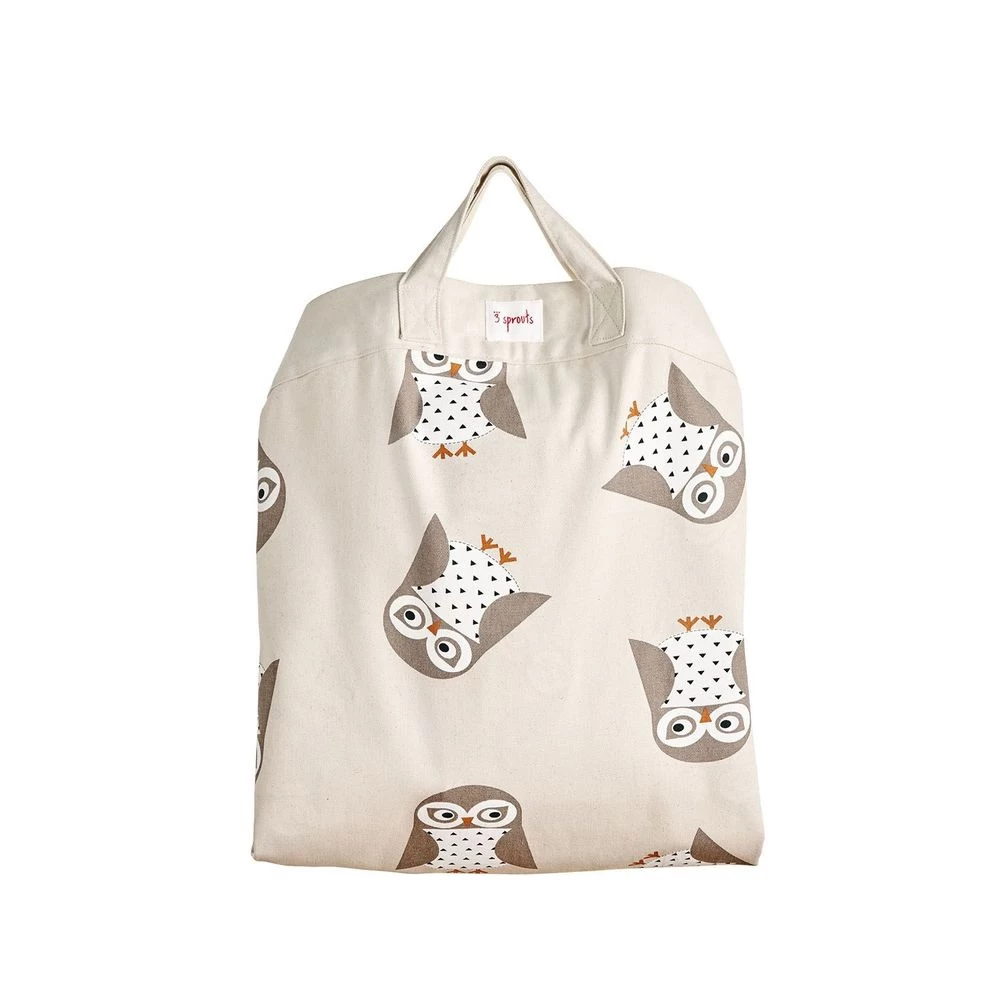 Sac à jouets / tapis de jeu 2 en 1 chouette de la marque 3 Sprouts. Ce tapis 2 en 1 est très pratique. Vous pourrez l’emmener partout avec vous et votre enfant pour qu’il puisse s’amuser. Ce tapis de jeu servira aussi de sac de rangement pour les jouets de votre enfant. Le tapis se transforme en sac et se ferme grâce à du scratch. Deux poignées sont cousues sur le tapis.