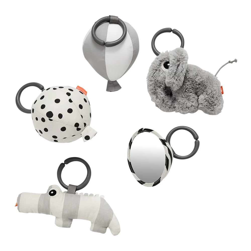 Croco craquera au toucher, Elphee hochera, le petit miroir lui rendra son sourire et les ballons contiennent un carillon et une cloche, le tout pour stimuler votre bébé.