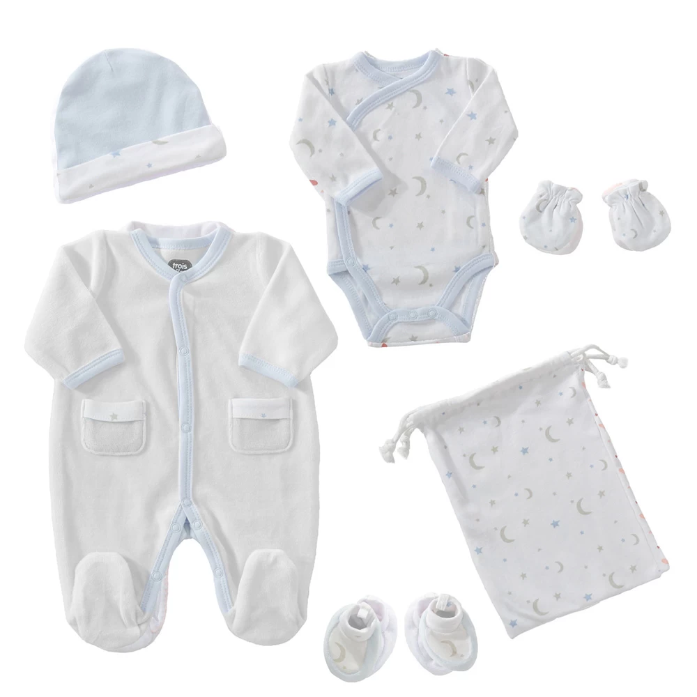 Ce kit naissance garçon est composé de 5 indispensables naissance et d’un sac en tissu assorti pour le glisser à l’intérieur.