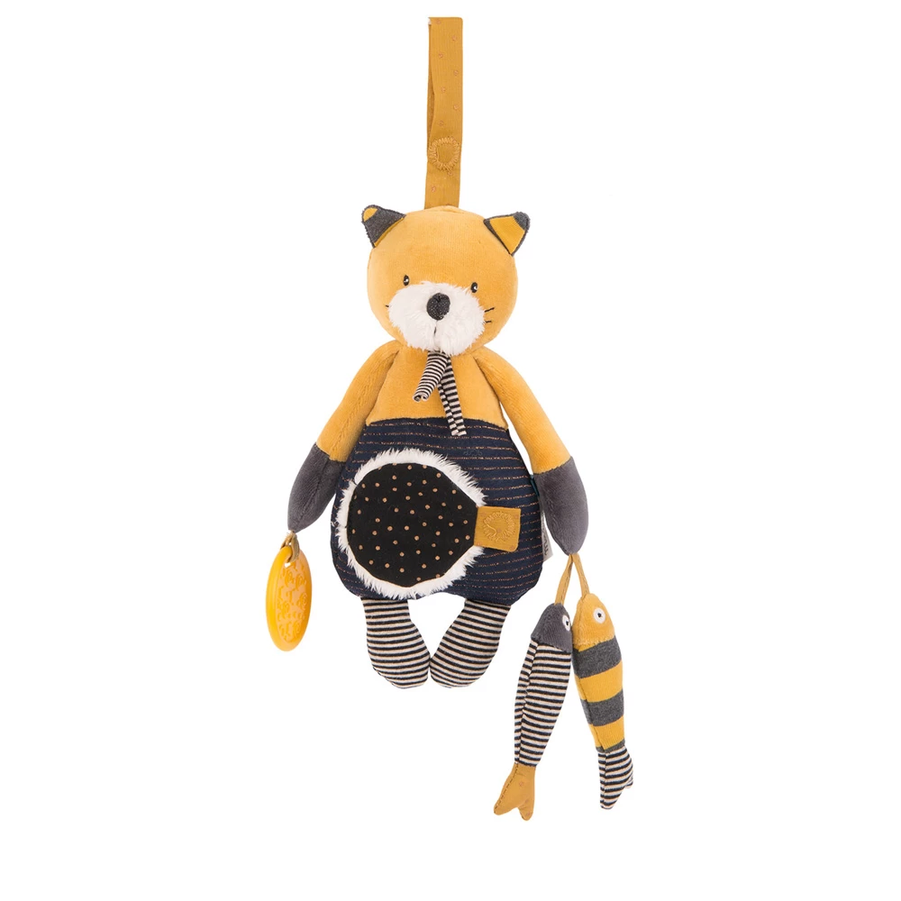 Lulu le chat a tout ce qu’il faut pour amuser bébé ! Il transporte une spatule dentaire, des sardines avec papier crissant et surprise… un miroir caché dans sa combinaison ! Il s’accroche partout grâce à son lien, et fait gling-gling quand on le secoue !