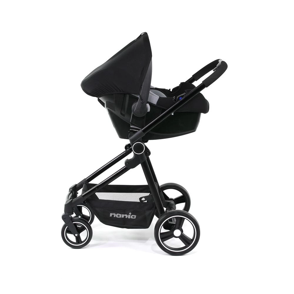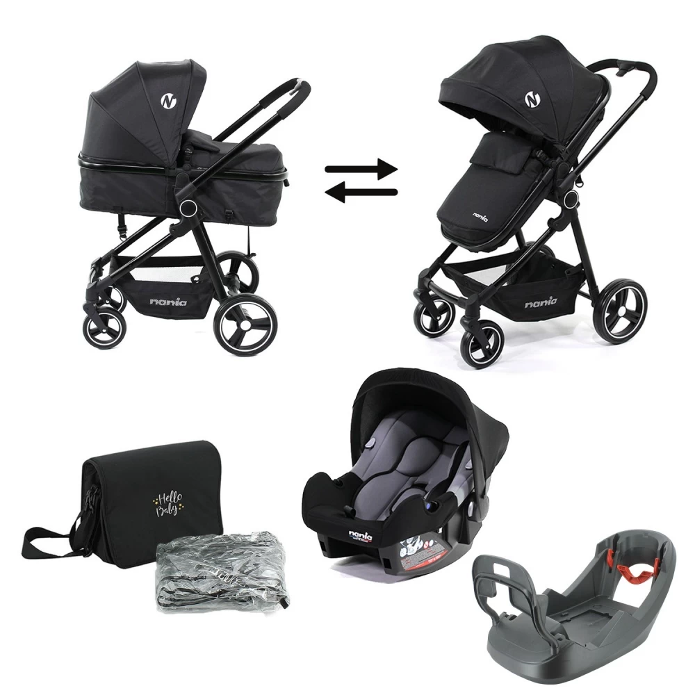 Ensemble complet qui comprend : la poussette combinée GIULIA , un siège auto BEONE groupe 0+ homologué selon la norme ECE R44, un sac à langer, un habillage pluie + la base beone pour l’installation dans la voiture