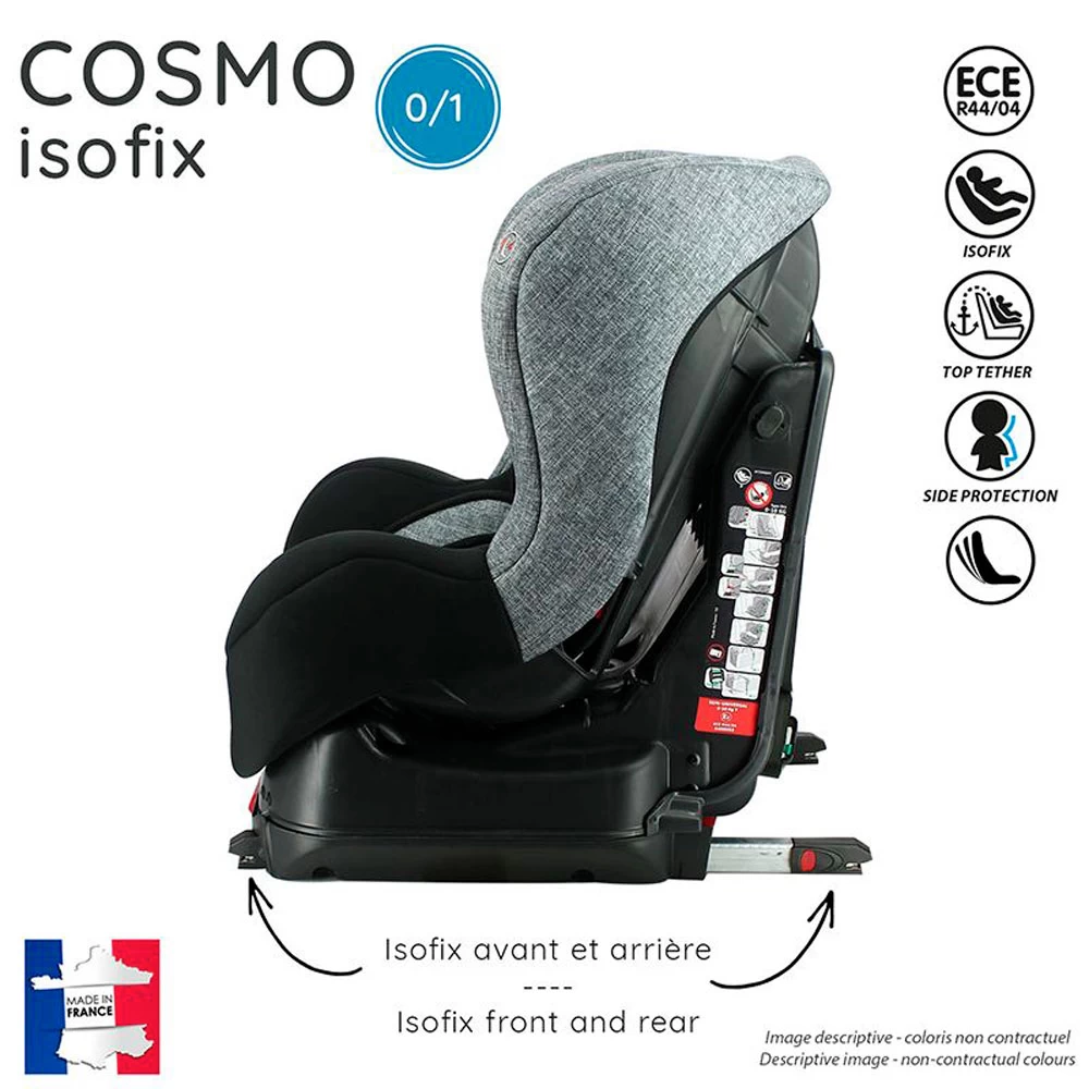 Siège auto isofix COSMO groupe 0/1 pour les enfants dès la naissance à 18kg, homologué selon la norme ECE R44/04, fabriqué et testé en France.