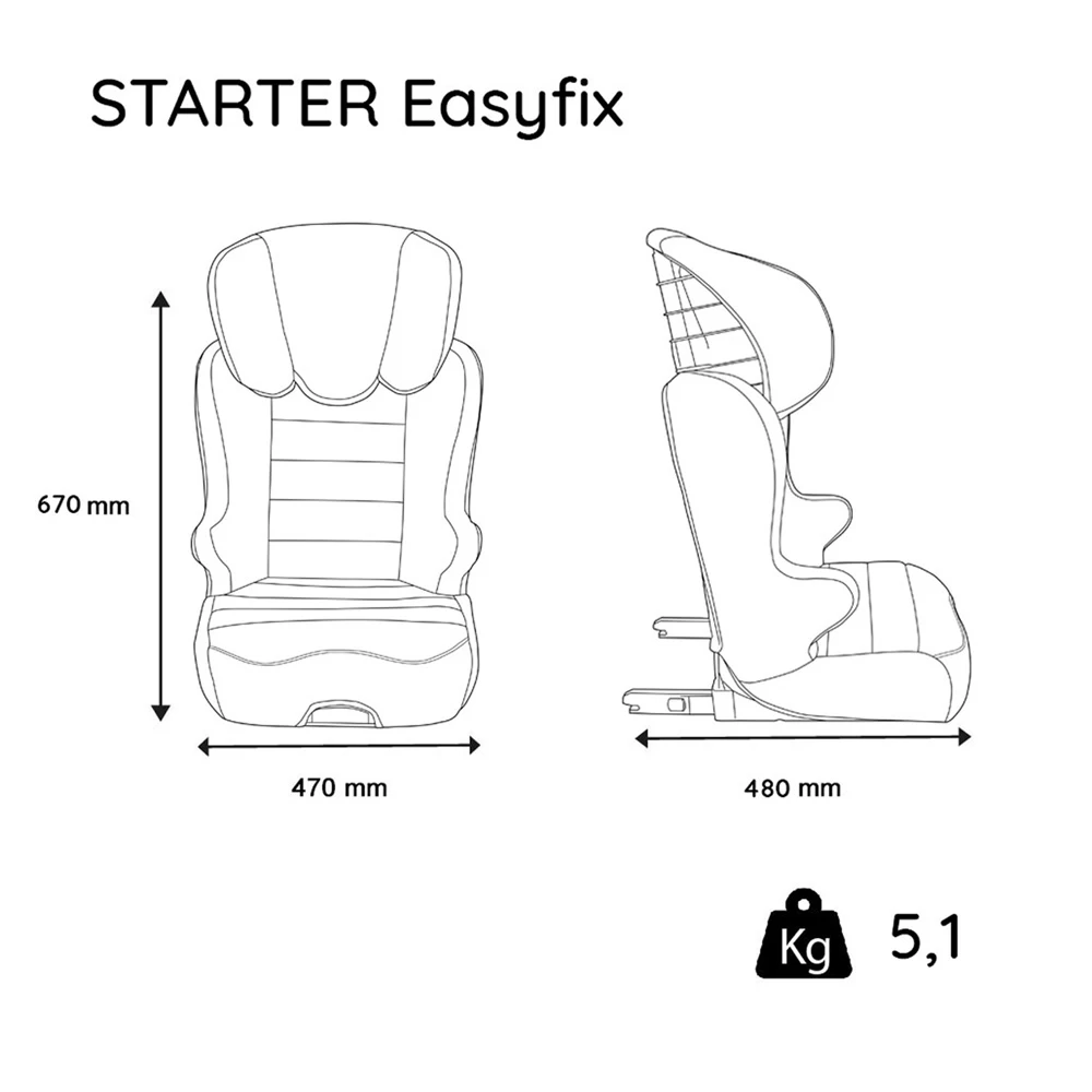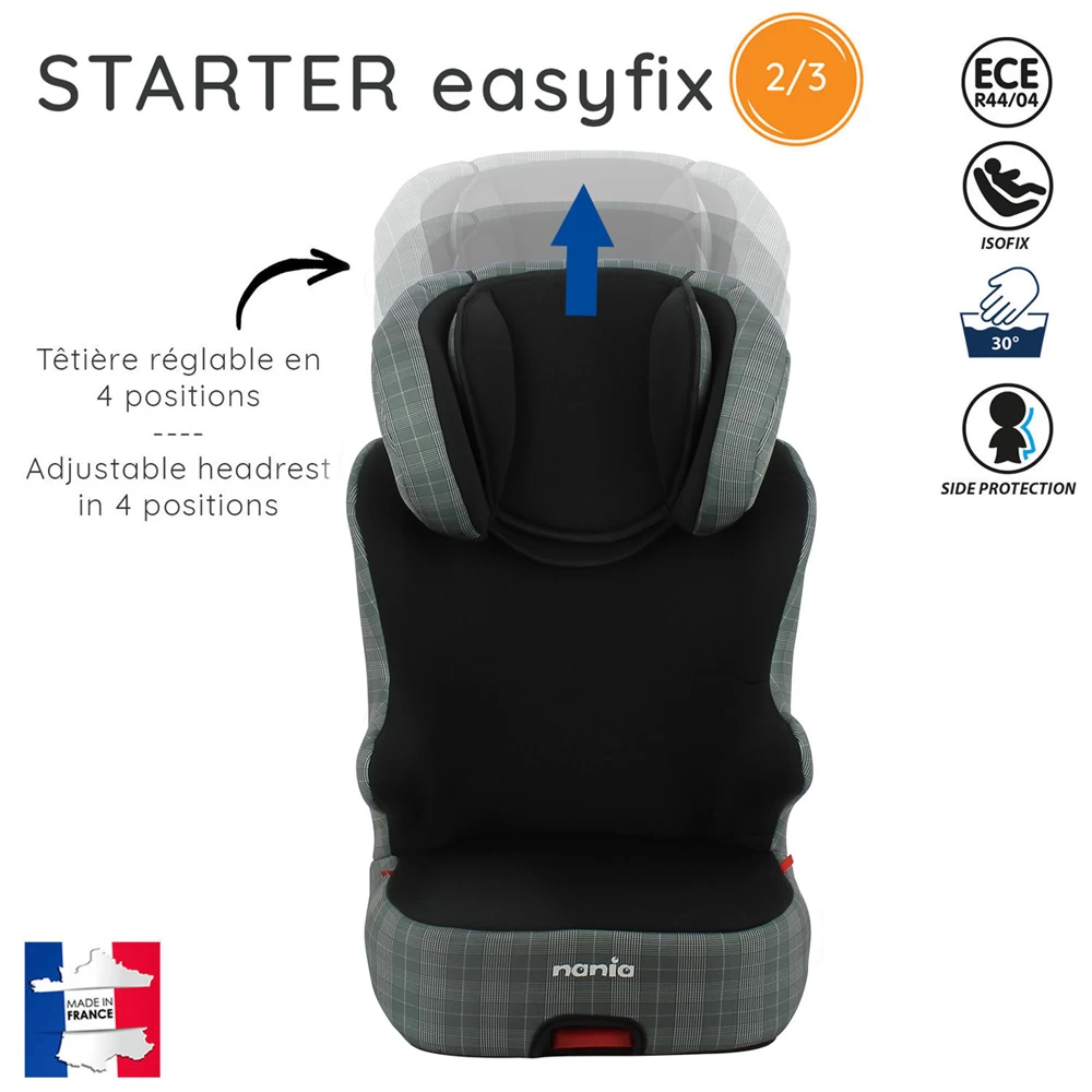 Le siège auto STARTER Easyfix du groupe 2/3 de chez Nania. Il est utilisable de 15 à 36 kg soit de 5 ans à 10 ans environ. Ce rehausseur enfant est fabriqué et testé en France, de plus il est homologué selon la norme ECE R44/04.
