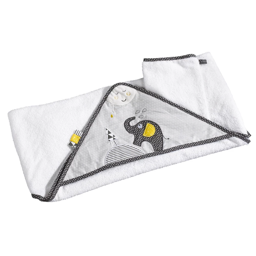 Idéal pour un cadeau de naissance, cette jolie parure de bain en blanc et gris accueillera bébé à la sortie du bain !