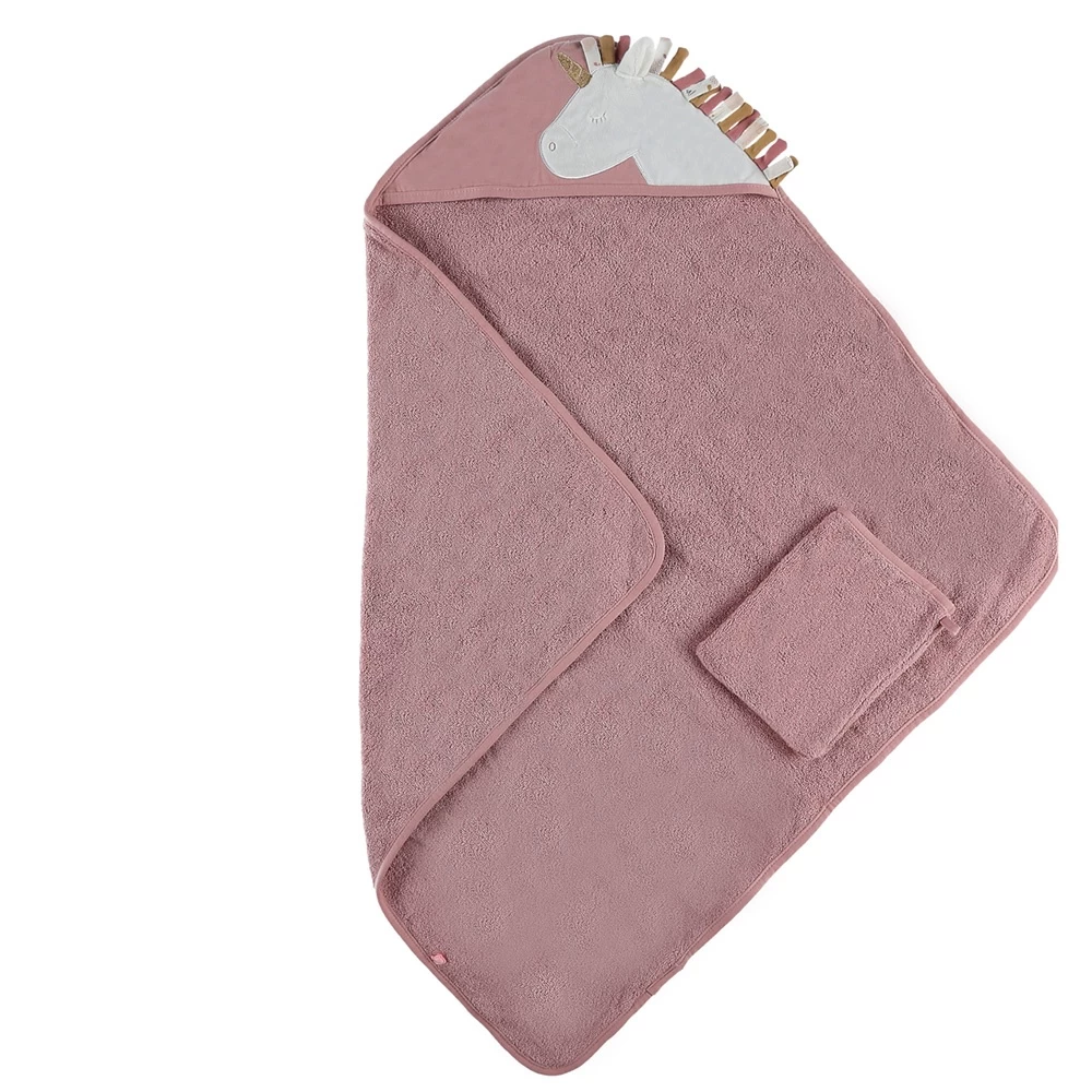 Le set de bain Lina & Joy en matière absorbante comprend une cape de bain gansé rose et un gant de toilette assorti.